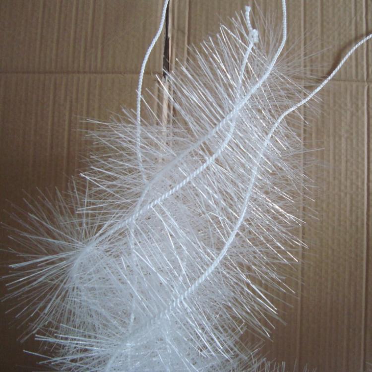 彈性填料篩選用聚烯烴類和聚酰胺中的幾種耐腐、耐溫、耐老化的品種,混合以親水、吸附、抗熱氧等助劑,采用特殊的拉絲、絲條制毛工藝,將絲條穿插同著在耐腐、高強度的中心繩上。由于選材和工藝配方精良,剛?cè)徇m度,使絲條呈立體均勻排列輻射狀態(tài),制成了懸掛式立體彈性填料的單體.填料在有效區(qū)域內(nèi)能立體全方位均勻舒展?jié)M布,使氣、水、生物膜得到充分混滲接觸交換,生物膜不僅能均勻地著床在每一根絲條上,保持良好的活性和空隙可變性,而且能在運行過程中獲得大的比表面積。