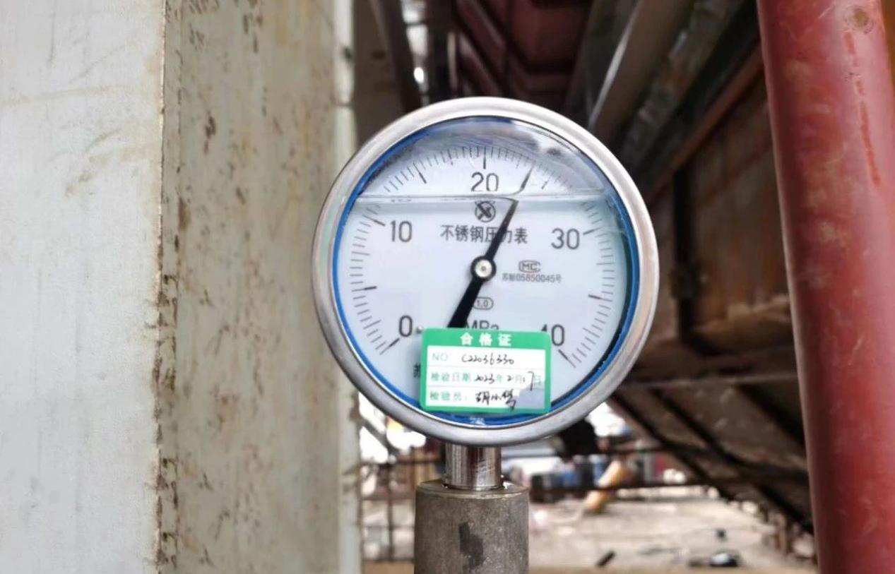 本次水壓試驗達(dá)到試驗壓力23.75mpa,穩(wěn)壓20分鐘無壓降。水壓試驗過程中,現(xiàn)場檢查小組對系統(tǒng)進(jìn)行3次全面檢查,各受壓元件金屬管壁和所有焊縫無水痕、無泄漏、無變形,各項技術(shù)指標(biāo)均達(dá)到了設(shè)計要求,水壓試驗圓滿成功。